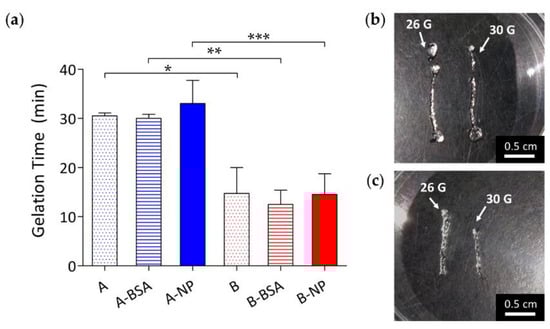 (a) Gelation time of hydrogels with polymer concentrations of 1.5% (A groups) and 3% (B groups) loaded with nothing (A and B), BSA (A-BSA and B-BSA), and BSA-laden PLGA NPs (A-NP and B-NP). Gelation times of the A groups were significantly longer than the B groups due to the higher initial polymer concentration of the B groups. Injection feasibility of group A and group B hydrogels are shown as (b) and (c), respectively. These hydrogels can be easily injected through 26 G and 30 G needle. (*: p ≤ 0.05; **: p ≤ 0.01; ***: p ≤ 0.001).