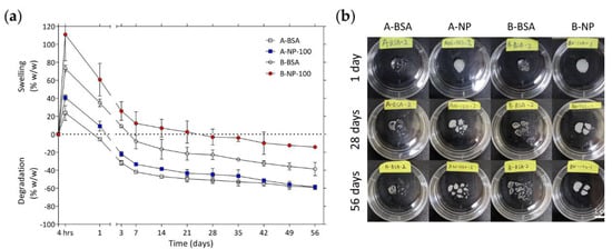 (a) Degree of swelling/degradation for various groups loaded with BSA and BSA-laden PLGA NPs. (b) Shows enlarged views of each groups after 1 day, 28 days, and 56 days incubation in PBS at 37 °C.
