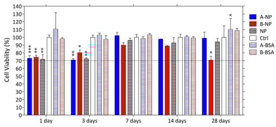 Cytotoxicity of the composite DDS to the ARPE-19 cells. The dashed line indicates 70% of cell viability. (*: p ≤ 0.05; **: p ≤ 0.01; ***: p ≤ 0.001).