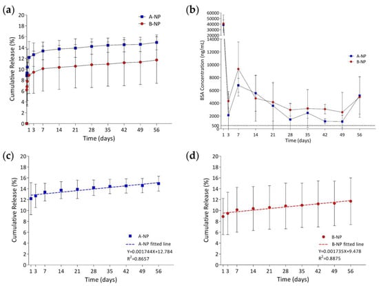 (a) Cumulative release percentage and (b) BSA release concentration of group A-NP and group B-NP. The dashed line indicates the minimum anti-VEGF drugs needed to block VEGF effectively, which was 500 ng/mL. Linearly fitted lines of group ANP and group BNP releasing BSA are shown in ((c),d), respectively.