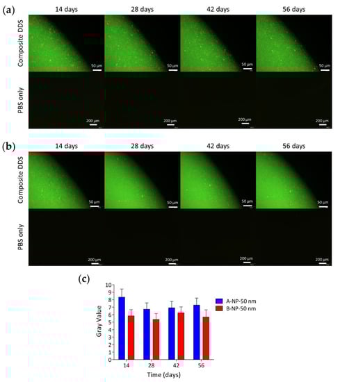 For group A-NP-50nm and group B-NP-50nm, the media were observed separately at a constant exposure time of 1 sec for all groups at different time points. To quantify the released amount of PS fluorescent nanoparticles, the mean gray value of each photograph (media only) was increased using Image J (NIH) in the same picture area.