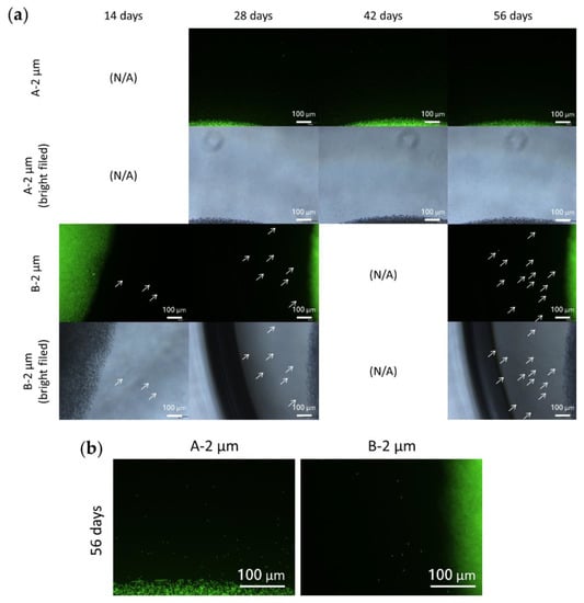 (a) Distribution of 2 µm PS fluorescent microparticles in the hydrogel with polymer concentrations of 1.5% and 3%. White arrows indicate the microparticles released from the hydrogel. (b) Enlargements of the two groups after 56 days incubation, clearly showing that PS MPs were more easily released from groups with lower hydrogel polymer concentration. This finding corresponded to the groups loaded with PS NPs.