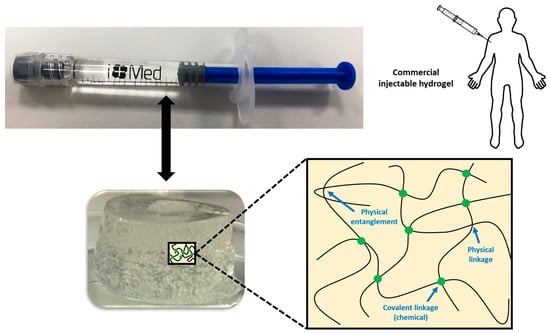 In general, injectable hydrogels demonstrated good biological response and biocompatibility, since they are usually synthetized from biopolymers obtained from the natural resources, as is the case of hyaluronic acid, chitosan, alginate, and heparin, among others []. That is why scientists are developing every day more and more biocompatible injectable biomaterials to be employed and applied in the different areas of the biomedical sector, such as controlled drug or gene delivery, wound-healing, tissue engineering, and biosensing [].