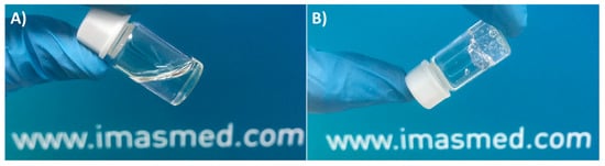 Although the study of gelation time and kinetics for the injection of already synthetized hydrogels into the human body has no sense, it is of special interest, especially in the preparation of hydrogels for in situ applications and subsequent crosslinking into the human body once injected []. The study of gelation is an easy, simple, and reliable technique that is generally governed by the mechanism responsible for the gel formation (physical or chemical interactions). Gelation can be determined by different methods, but, nowadays, the most used techniques are the “tabletop”-called ones, as is the case of the test vial inverting method (Figure 2), which possesses a rheological basis [].