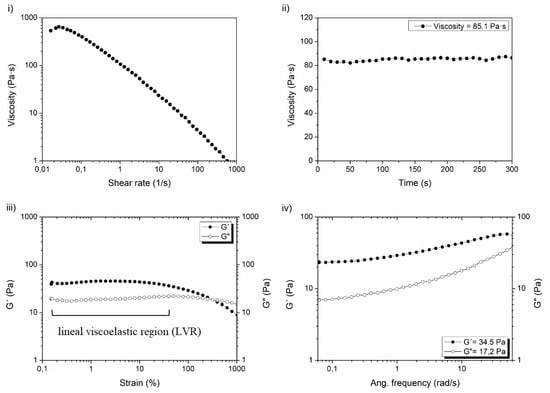 Steps of proposed protocol for standardization of the rheological characterization of injectable hydrogels: (i) determination of viscosity vs shear rate; (ii) viscosity vs time; (iii) elastic modulus (G′) and viscous modulus (G″) vs strain; (iv) elastic modulus (G′) vs Ang. frecuency.