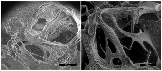 SEM and TEM techniques provide the three-dimensional image of the structure, topography, composition, pore size, pore size distribution, and aggregations and dispersions of polymeric network, among others []. The main difference between them is the magnification at which microscopes can work. While SEM can be controlled up to the range of six orders of magnitude about 10 to 500,000 times to observe microscale structures (Figure 5), the higher special resolution down to the level of atomic dimensions (<1 nm) obtained with TEM leads to the analysis of materials at nanoscale. The main disadvantage of both techniques is the necessity of drying the samples by the lyophilization process before analysis and therefore, the difficulty to measure nonconductive specimens. This problem of getting imaging faults due to the insufficient deflect of the electron beam can be solved by coating an ultrathin layer of an electrically conductive material, such as a gold layer. However, nowadays, there are variants of both techniques that permit the imaging of the hydrogels in their natural state without magnification or preparation, as is the case of environmental SEM (eSEM) and wet scanning TEM (STEM) [,]. While eSEM works at high humidity environment and images can be obtained under partial water vapor pressure, STEM enables the observations of totally emerged samples in liquid state, even though there are several micrometers of water. Another characterization technique that varies from SEM and enables the structural characterization of high-water content materials as hydrogels is cryo-scanning electron microscopy (cryo-SEM) []. Cryo-SEM has the potential to exhibit the most authentic insights in preserving the structure of hydrated biological specimens, such as polysaccharide hydrogels, while the solvent or dissolved components are maintained. It is based on the cryo-fixation of water by forming ice-crystals and vitrification process is involved []. However, in order to obtain high-quality cryo-SEM results, the cryo-fixation process must be controlled perfectly, since poor cryo-fixation process control could lead to structural damages of the polymeric network due to the formation of ice-crystal aggregates that would alter the hydrogel structure.