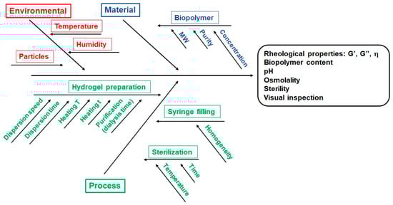 The process for the production of injectable hydrogels should be planned, starting from the quality by design approach (QbD). QbD pre-defines the properties of the targeted injectable hydrogel. It is based on statistical, analytical, and risk-management methods applied to understand the product and its fabrication process [].