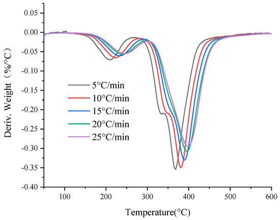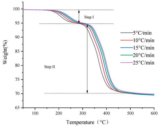 The TGA-DSC3+ simultaneous thermal analysis instrument from Mettler-Toledo, Zurich, Switzerland, is used to carry out the experiment under a nitrogen atmosphere of 50 mL/min, and 10 mg of each sample is placed in an alumina crucible. The heating rate is set to 5, 10, 15, 20 and 25 °C/min, respectively. The experimental temperature changes from room temperature 25 to 600 °C. Then the data of the sample mass with temperature is recorded by a computer.