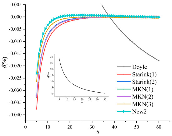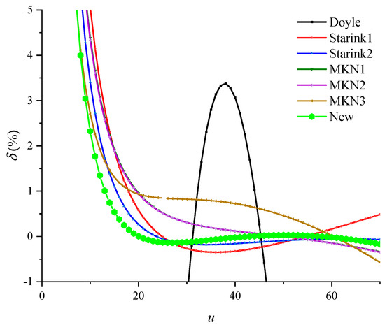 In order to evaluate the accuracy of Equation (17), let u take a value between 5 ≤ u ≤ 70. The Simpson’s numerical solution of temperature integral is taken as the exact value, which is compared with other exponential approximations in Table 2. The percentage deviation is shown in Figure 4, and the value range of u at typical percentage deviation is shown in Table 3.
