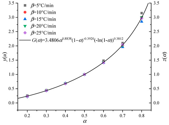 The activation energy E and temperature T obtained in the range of conversion α of polymer insulating materials can be substituted into the left side of Equation (27) to form the experimental function curve. If the pyrolytic reaction of the material can be described by a certain type of reaction mechanism function, the experimental curves should coincide with each other regardless of the heating rate. Substitute different conversion rates α into the right side of Equation (27), and fit the experimental curve obtained by Equation (12) by the least square method to obtain the corresponding parameters m, n and p.