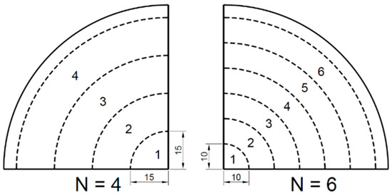 Figure 2 displays that the surface of the PLA sheet was equally divided into a number of zones (N), i.e., N = 4 and N = 6, by two different division distances (15 and 10 mm). Each zone had a unique processing temperature (Tp) to guarantee the axisymmetric deformation. The nodal temperatures in the FEA model were defined at a range from Tp = 72 to 77 °C and considered to be constant in a short duration of forming process (of 0.2 s). The temperature of the elements crossing the edge of two adjacent zones was interpolated by the nodal temperature.