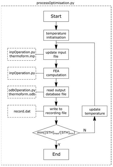 An optimisation procedure was developed by a flowchart in Figure 3. A python script file (‘processOptimisation.py’) was used to control the whole optimising process, where an optimisation algorithm in an open-source library (‘Scipy: L-BFGS’) was employed. The initial processing temperature was set to be Tp = 77 °C for all the zones. An input file (‘thermoform.inp’) for the FEA model was built based on the geometric information, material properties and boundary/loading conditions aforementioned. This input file was updated by a python file (‘inpOperation.py’) using the new zone temperature values, which executed the FEA computation. When each computation cycle was completed, a result manipulation program (‘odbOperation.py’) read the resulted thickness and temperature of each zone from the output database (‘thermoform.odb’). These results were written into a recording file (‘record.dat’) to track the optimisation process. An objective function of minimal ratio was defined by assessing the ratio of biggest zone spatial thickness ((STH)max) over smallest zone spatial thickness ((STH)min). This ratio was optimised by updating the temperature profile until a minimal result was reached.
