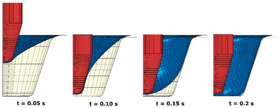 At the initial prescribed processing temperature of Tp = 77 °C (Figure 4), thermoforming of a PLA container showed that the push from the axial motion of the plug produced an indented sheet (t = 0.05 s). As the further push was introduced, more materials started to build contact with the top end of the plug (t = 0.1 s). At this stage, no material was found to touch the mould. When the vacuum was applied, the sheet surface was inflated and contacted the side of mould primarily (t = 0.15 s). Then, the contact between the bottom surface and the mould was built after a further 0.05 s to form the final shape (t = 0.2 s).