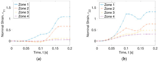 The hoop strain (ε11) history (Figure 5a) displayed that the increase of strain occurred at zone 1 within a radius (R) of 15 mm before t = 0.1 s during the plug stretching process at a peak strain rate of 1.3 s−1. At this time period, the growth of axial strain (ε22) history at the 4 zones along the in-plane directions was illustrated at all the zones at different deformation stage (Figure 5b). The highest axial strain rate was found to be 26.6 s−1 at zone 1 and the lowest value was 3.1 s−1 at zone 4. At t = 0.1 s, the achieved biaxial strain at zone 1 was 0.3 (ε11) and 1.3 (ε22), respectively. There was constant width (CW) stretch at zones 2 to 4, with the axial strain (ε22) ranging from 0.2 to 0.5. After the activation of vacuum (t = 0.1 s), a dramatic increase of hoop strain (ε11) was observed along zones 1 and 2 within a radial distance (R) of 30 mm at a rate of 20.4 and 14.6 s−1 (Figure 5a). At the radius out of 30 mm, there was very low hoop strain rate at zone 3 (1.7 s−1) and zone 4 (0.4 s−1). Application of vacuum introduced a slight decrease of axial strain at zones 1 and 2 but an increase at zones 3 and 4 before t = 0.15 s (Figure 5b). After that, the axial strain increased again at zone 1 by a rate of 14.4 s−1 and zone 2 by a rate of 10.5 s−1, and a stable deformation was reached after t = 0.17 s at 4 zones. The overall forming process indicated a big stretch for regions near the centre (R < 30 mm) and a small deformation at other areas at uniform processing temperature profile (Tp = 77 °C).