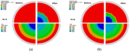 By employing the optimal temperature (TEMP) profile at the two cases (N = 4 and 6), the spatial thickness (STH) distribution of formed sheet was compared with the result at the uniform temperature profile (Tp = 77 °C) in Figure 8. It can be seen that non-uniform temperature distribution was presented after optimisation at a similar gradient at the two cases, which introduced the change of thickness profile. For both cases, high temperature of Tp = 77 °C (red) covered the area near the edge of the sheet and there was a low-temperature region (Tp = 72 °C) (blue) near the central region. The temperature between Tp = 72 to 73 °C occupied the major transition part from low to high temperature at N = 4 (Figure 8a). This region had a high-level temperature of Tp = 73 to 75 °C at N = 6 (Figure 8b). Before optimisation, a thickness profile ranging from 0.4 to 1.6 mm along the whole sheet was found. By optimisation, the minimum thickness was improved to be over 0.61 mm. There was a similar thickness distribution of 1.02 to 1.65 mm (colour: light green, yellow and red) at both divisions (N = 4 and 6). The thickness ranging from 0.61 to 0.82 mm (colour: light blue) covered a smaller area at N = 4 than at N = 6. There was a wider distribution of thickness from 0.82 to 1.02 mm (colour: dark green) at the case of less division (N = 4).