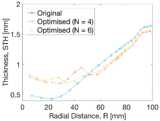 In Figure 9, the thickness distribution along the radius from centre to edge illustrated a big increase from 0.5 to 0.7 mm by 40% within R = 50 mm after optimisation. A small decrease of thickness of 0.1 mm was observed from optimisation beyond R = 50 mm. The overall thickness ranged from 0.7 to 1.6 mm after optimisation. Between the distance of R = 30 to 50 mm, a smoother transition of thickness was exhibited at uniform temperature profile than the results at non-uniform cases. A step change of thickness was more evidently found at the optimised temperature at N = 4, indicating a sharp increase and decrease at distance from R = 30 to 60 mm. This tendency was weakened at N = 6 by introducing a small temperature gradient with more divisions.