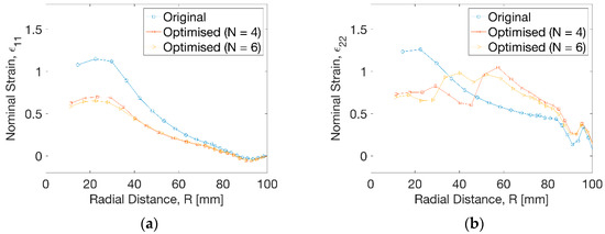 The results of nominal strain in Figure 10a displayed a big decrease of hoop strain (ε11) at the radius of R = 30 mm from ε11 = 1.1 to 0.6 by an approximate decrease of 45%. The degree of decrease of hoop strain beyond R = 30 mm reduced gradually and disappeared after R = 72 mm. Figure 10b showed a decrease of axial strain (ε22) by optimisation from ε22 = 1.3 to 0.7 within a radius of R = 30 mm. No monotonic change of axial strain (ε22) at uniform temperature profile was observed compared to the result from optimisation. At N = 4, the decease of axial strain by optimisation continued until the radius of R = 48 mm and the elevation of axial strain occurred. This tendency showed some differences for the optimisation result at N = 6, indicating a dramatic decrease of axial strain and subsequent increase until R = 38 mm, after which the axial strain from optimisation exceeded the result at uniform temperature. Beyond R = 82 mm, there was a small difference of the hoop and axial strain before and after optimisation, leading to a slight drop of the wall thickness.