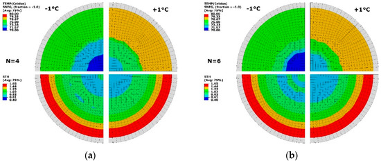The thermal sensitivity of optimisation condition was studied by applying a temperature perturbation (of ±1 °C) on the optimal results of 2 cases (N = 4, 6) in Figure 11. At N = 4 (Figure 11a), a temperature difference was exhibited at low and high temperature levels. The thickness distribution showed the similar results, and a minimum thickness of 0.61 mm was found. The area with thickness ranging from 0.61 to 1.23 mm had similar distribution to the result without perturbation. At N = 6 (Figure 11b), an altering change of thickness was displayed within the radius of R = 20 mm by reducing the temperature. The overall thickness distribution had no difference after applying perturbation. The result of perturbation proved that the optimisation was primarily from the temperature profile at different zones based on the divisions with a tolerance of ±1 °C. At the optimal temperature distribution, enough robustness was illustrated, which helped develop the temperature-controlling strategy in the practice.