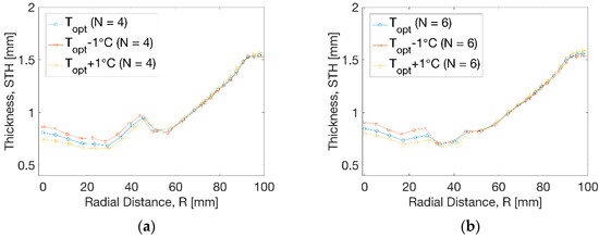 The thickness distribution at temperature perturbation is shown in Figure 12. At N = 4 (Figure 12a), a minor influence from temperature on the thickness was observed within the radius of R = 45 mm. The thickness moved to a slightly higher level by the decrease of temperature and a lower level due to the increase of temperature. There was no evident effect on the thickness beyond the radius of R = 45 mm. At N = 6 (Figure 12b), the temperature perturbation induced a similar trend with reduced thickness near the centre by increase of temperature within R = 35 mm. The result showed an improvement of 0.7 mm compared to the result of 0.5 mm before optimisation.