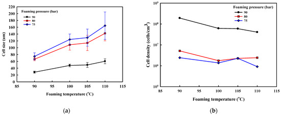 The SEM micrographs of ETPU prepared under different foaming temperatures and pressures are shown in Figure 2. The cell diameter and density measured from Figure 2, and the expansion ratio determined from the density measurements of the pellet before and after foaming shown in Figure 3, reflect the effect of the foaming temperature and pressure on these values. It can be seen in Figure 2 that under the temperature and pressure conditions used in this study, the ETPU foam has a closed cell structure. As can be seen in Figure 2, when the pressure is low (75 bar), the cell is not fully developed and the walls between cells are thick, suggesting that the condition is not adequate for preparing ETPU. The cell size decreases with the rise in pressure and at 90 bar, the cell diameter is 20–60 μm and the cell density is 108 cells/cm3, allowing it to be classified as a fine cell foam [32], regardless of the temperature. In contrast, below 90 bar, the cell diameter is greater than 100 μm and the cell density is 106 cells/cm3, representative of conventional cell foam. This is a result of more nuclei being formed in the TPU at higher pressures, where the same total amount of CO2 is subsequently diffused and the expansion occurring therefrom forms relatively smaller cells. At a fixed pressure, a temperature increase decreases the viscosity of TPU and results in larger cells and lower cell density. The expansion ratio increases with the increase in the pressure and temperature of the foaming process, suggesting that it is more dependent on the cell size compared with cell density. As can be seen in Figure 3c, the expansion ratio of most ETPU obtained in this study is generally below 4, characteristic of high-density foams. However, when the foaming is carried out at 80–90 bar and 110 °C, medium-density foams characterized by expansion ratios of 4–10 are obtained, and when the foaming is carried out at 90 bar and 110 °C, the highest expansion ratio of 7 is obtained. The foam structure, which is dependent on the foaming conditions, will no doubt affect the properties of the foam sheets made from ETPU beads.