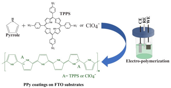 Pyrrole electro-polymerizations were carried out in a conventional three-electrode cell by using FTO substrates as working electrodes (WE), a platinum foil as counter-electrode (CE) and an Ag/AgCl electrode as reference electrode (RE) (Figure 1). The thickness of the coatings was controlled by the supplied electric charge. For TPPS-doped PPy, the electrosynthesis was accomplished by a galvanostatic signal (0.02 mA/cm2) using a precursor solution composed of 0.1 M pyrrole and 0.1 mM TPPS in deionized water. For ClO4−-doped PPy the electrosynthesis was accomplished under 0.5 mA/cm2 using a solution composed of 0.25 M pyrrole and 0.5 M LiClO4 in acetonitrile +2% w/w H2O. For the obtention of CoTPPS-doped PPy a previously reported route was used [26]. In this way, Co2+ ions were introduced into the porphyrin by immersion (10 min) of TPPS-doped PPy in aqueous 0.1 M cobalt acetate solution heated to 90 °C.
