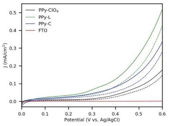 With respect to the magnitude of the current densities, it had the following order from highest to lowest: PPy-L, PPy-C and PPy-ClO4. This trend was also observed in the coatings obtained with 31 mC/cm2 (Figure S6A), and in general, no noticeable differences were found between the 42 mC/cm2 and 31 mC/cm2 films. On the other hand, for the coatings deposited with 21 mC/cm2, it was only possible to obtain LSV curves with and without illumination for PPy-C and PPy-ClO4. In the case of PPy-L, it degrades rapidly and each successive LSV exhibited a curve with lower current densities (Figure S6B).