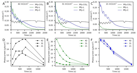 Chopped chronoamperometry of PPy-films synthesized with electric charges of: (A) 42 mC/cm2, (B) 31 mC/cm2 and (C) 21 mC/cm2. Photocurrent stability and its relation with the electric charge of polymerization for (D) PPy-ClO4, (E) PPy-L and (F) PPy-C. 0.1 M Na2S2O3 as electrolyte, 0.6 V vs. Ag/AgCl as applied potential.
