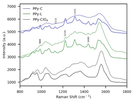 Raman characterization of PPy-ClO4, PPy-L and PPy-C before (continuous lines) and after (dashed lines) the photoelectrochemical test under anodic conditions (light chopped chronoamperometry at 0.6 V in 0.1 M Na2S2O3).