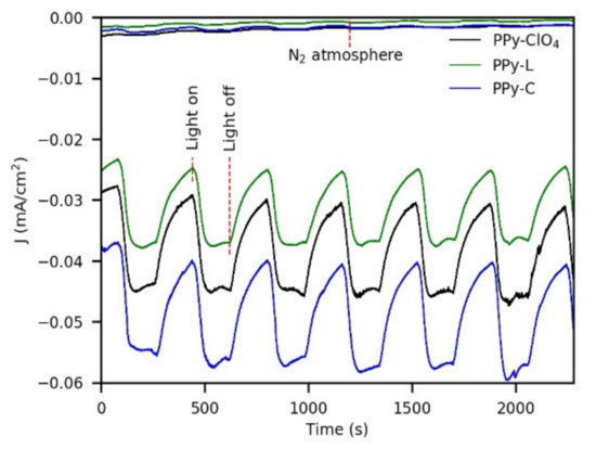 Chronoamperometry measurements using chopped light were performed at −0.4 V vs. Ag/AgCl in 0.1 M Na2SO4 to study the stability of the composite materials under cathodic conditions (periods of illumination and darkness lasted 3 min each one). For this purpose, photoelectrodes of PPy-ClO4, PPy-L and PPy-C were synthesized with 42 mC/cm2. Characterizations were carried out in solutions previously bubbled with N2 and with air for 15 min to analyze the activity of the photoelectrodes towards oxygen reduction (Figure 8). In the case of deoxygenated solutions, a nitrogen atmosphere was maintained over the solution during the test. In the characterization, all the photoelectrodes showed photocathodic currents under the air atmosphere. These photocurrents can be attributed to oxygen reduction since negligible currents and photocurrents were obtained under nitrogen atmosphere.