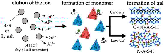 The production of ordinary Portland cement (OPC), which is the main material in conventional concrete structures, has increased rapidly in recent years. However, the production of OPC is responsible for releasing a large amount of CO2 into the atmosphere, and these emissions can be assessed from the viewpoint of two aspects. The first aspect is the chemical reaction involved in the production of the main component of cement, i.e., clinker, as carbonates (largely CaCO3, found in limestone) that are decomposed into oxides (largely lime, CaO) and CO2 (CaCO3 → CaO + CO2↑) by the application of heat. The second aspect involves consumption of large amounts of fossil fuels that are burned at about 1400 °C. Owing to these two causes, approximately 0.75–0.85 tons of CO2 is typically emitted to produce 1 ton of Portland cement. The total CO2 emissions from the cement industry have increased rapidly in recent years, accounting for about 4% [] of the total CO2 emissions in Japan and 8% [] globally, and constitute the third largest source of anthropogenic CO2 emissions. The demand for reducing CO2 emissions is thus increasing as a measure for mitigating environmental problems, such as global warming; hence, materials that can sufficiently replace cement are required. In recent years, alkali-activated cements (AACS) have been studied as building materials to replace cement. AACS are generally composed of aluminosilicate powders, such as blast furnace slag (BFS), fly ash (FA), and metakaolin (MK), along with alkali activators such as sodium silicate (Na2O·SiO2·xH2O; water glass) and sodium hydroxide (NaOH). OPC hardens via hydration reaction with water, but in the case of the AACS, Si4+, Al3+, and Ca2+ contained in the binder elute and react with the alkali activators (Figure 1). It has been reported that AACS have a CO2 reduction effect of about 80% compared to OPC because the AACS do not contain OPC []. In addition, AACS have excellent strength development [], better acid resistance [,,], and better heat resistance [,,] than normal cement concrete.