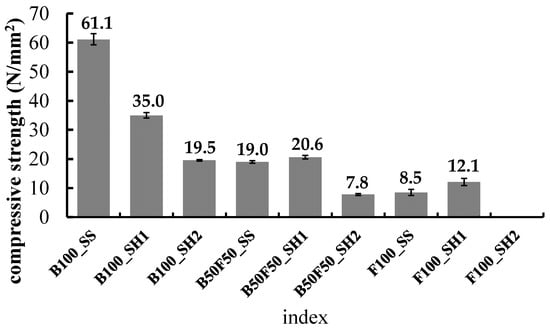Figure 2 shows the compressive strength of each specimen at 8 weeks age. Figure 3, Figure 4 and Figure 5 show the changes in the compressive strength ratios with age for each specimen at 8 weeks age. First, in the B100 specimens, the strength at 8 weeks was 61.1 N/mm2 for B100_SS, 35.0 N/mm2 for B100_SH1, and 19.5 N/mm2 for B100_SH2. These measurements confirmed that the compressive strengths varied greatly depending on the type of alkali activator used. In the case of sodium silicate (SS) as the alkali activator, we considered that the compressive strength was different because the C–(N)–A–S–H structure was different from B100_SH1 and B100_SH2 because of the supply of Si from the alkali activator. Thus, it was confirmed that the effects of the type of alkali activator used on the compressive strengths were small in the B50F50 and F100 specimens. Further, it was confirmed that the strength of the F100 test piece was lower than those of the B100 and B50F50 test pieces. The B0_SH2 sample could not be demolded because of insufficient hardening at the age of 1 day. C.D. Atis et al. [] investigated the effects of different curing temperatures on the compressive strengths using FA-based geopolymer mortars with different Na+ concentrations. Compared with their results, in the case of F100_SH2, we consider that the curing time and temperature were insufficient for the present method (60 °C, 6 h).