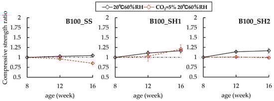 Changes in compressive strength ratios of B100 specimens at 8 weeks.
