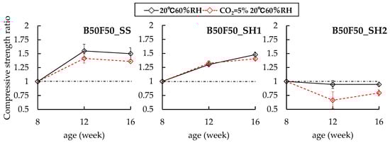 Changes in compressive strength ratios of B50F50 specimens at 8 weeks.