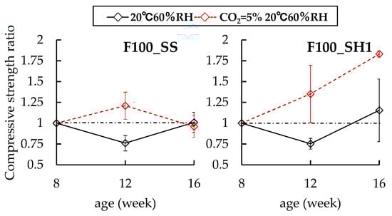 Changes in compressive strength ratios of F100 specimens at 8 weeks.