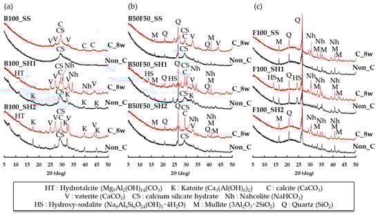 XRD results for paste specimens of (a) B100_SS, B100_SH1 and B100_SH2, (b) B50F50_SS, B50F50_SH1 and B50F50_SH2, and (c) F100_SS, F100_SH1 and F100_SH2, Non_C: 8 weeks, C_8w: 16 weeks (carbonation of 8 weeks).