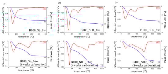 Thermogravimetric/differential thermal gravimetric (TG/DTG) analysis results for specimens of (a) B100_SS_8w and B100_SS_16w (8 weeks carbonation), (b) B100_SH1_8w and B100_SH1_16w (8 weeks carbonation), and (c) B100_SH2_8w and B100_SH2_16w (8 weeks carbonation).