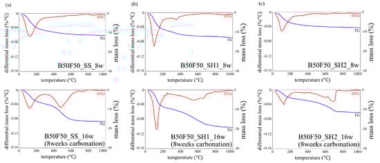Thermogravimetric/differential thermal gravimetric (TG/DTG) analysis results for specimens of (a) B50F50_SS_8w and B50F50_SS_16w (8 weeks carbonation), (b) B50F50_SH1_8w and B50F50_SH1_16w (8 weeks carbonation), and (c) B50F50_SH2_8w and B50F50_SH2_16w (8 weeks carbonation).