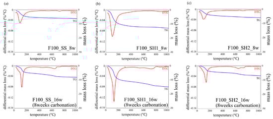Thermogravimetric/differential thermal gravimetric (TG/DTG) analysis results for specimens of (a) F100_SS_8w and F100_SS_16w (8 weeks carbonation), (b) F100_SH1_8w and F100_SH1_16w (8 weeks carbonation), and (c) F100_SH2_8w and F100_SH2_16w (8 weeks carbonation).