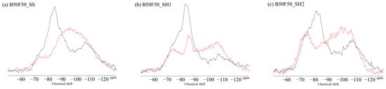 Solid-state 29Si MAS NMR chemical shifts for (a) B50F50_SS, (b) B50F50_SH1, and (c) B50F50_SH2 samples.