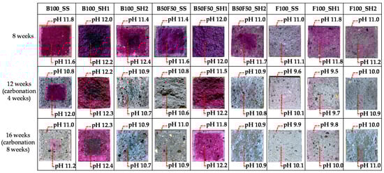 Figure 15 shows the changes in the color of the mortar specimens after spraying with phenolphthalein at 8 weeks of age as well as 4 and 8 weeks of accelerated carbonation. In addition, the results of the pH outside the cross section (5 mm from the surface) and at the center of the section (20 mm square at the center) are shown. The pH of the specimen affects the stability of the hydrate, because C–(N)–A–S–H is stable at high pH (>12) and N-A-S-H is stable at low pH (<12) [].