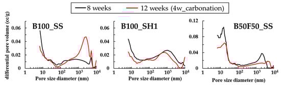 In the results of the compressive strength, significant decrease in compressive strength was observed in the specimens using SS as the BFS base. At the level of SH2 addition, it is thought that the strength-generating structure was not formed due to insufficient alkali activator. Regarding this decrease in compressive strength, we predicted that carbonation shrinkage caused by structural changes of C–(N)–A–S–H under high-concentration CO2 conditions was the cause. Therefore, we observed changes in pore structure due to high concentration accelerated carbonation on the B100_SS test specimen, which showed a decrease in compressive strength. As a comparison group for the experiment, B100_SH with no decrease in strength at the level based on BFS, and B50F50_SS specimens containing BFS and SS but with no decrease in strength were used. Mercury intrusion porosimetry (MIP) was performed using a Quantachrome/PoreMaster33. The measurement samples were prepared by mortar specimen into diameter 5 × height 5 mm size cylinders, performing vacuum freeze-drying for 24 h for thorough drying [].
