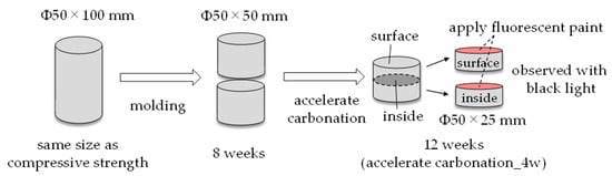 For crack observation, φ50 × 100 mm, which is the same size as the compressive strength, was used. The test piece was formed into φ50 × 50 mm at 8 weeks of age, and then accelerated carbonation was performed. At 12 weeks of age (4 weeks of accelerated carbonation), the specimen was molded from φ50 × 50 mm to φ50 × 25 mm in order to observe both the surface and the inside of the specimen. After that, a fluorescent paint was applied to the cross section of the test piece, and cracks were observed using black light to make it easier to see the cracks (Figure 17).