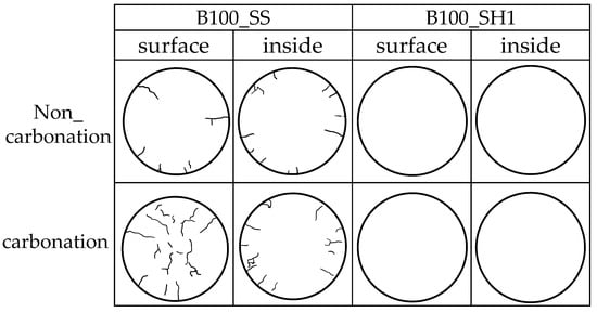 Figure 18 traced only the cracks to make the cracks easier to see. In B100_SS, it was confirmed that accelerated carbonation caused cracks in the entire specimen. The occurrence of this crack is considered to be the direct cause of the decrease in compressive strength by carbonation. From this result, in the accelerated carbonation behavior of the test specimen including BFS and SS, decalcification of the C–(N)–A–S–H structure lowers the cohesive force of the entire structure, and cracks can be generated from the change of the pores. It was confirmed that cracking occurred even without accelerating carbonation, which may be affected by the relatively fast curing speed of fresh mortar using BFS and SS. Here, in the cracking of B100_SS (specimens using only BFS and sodium silicate) in an environment without accelerated carbonation (actual environment), it is unclear whether a decrease in compressive strength may occur from a long-term perspective. On the other hand, no cracks were confirmed in B100_SH1. Here, from the results of XRD, TG-DTG, and 29Si MAS NMR using the paste specimens, decalcification of C–(N)–A–S–H that appears in B100_SS is confirmed in B100_SH1 as well. However, considering the matrix of the mortar specimen, carbonation occurs only on the surface of the specimen. The formation of carbonates containing Na+ on the surface helps to suppress the penetration of CO2.