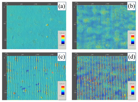 The polymer samples were structured with periodic line-like patterns adjusting the experimental setup according to equation 1 to induce spatial periods of 3 µm and 6 µm on the surface of the sample. Multi-pulse laser structuring was carried out delivering 2, 4, 6, 8, and 10 laser pulses at a laser fluence of 0.47 J/cm2. Previous experiments allowed one to determine this laser fluence as optimal to process this material. Lower and higher laser fluences were found to be unsuitable since neither produced any effect on the material nor induced significant damage. Figure 3 shows surface topographies of structured samples with spatial periods Λ of 3 µm (a and b) and 6 µm (c and d) using 2 (left) and 6 (right) laser pulses of 0.47 J/cm2. Experimental period of the interference pattern was assessed by confocal microscopy, resulting in 3.03 ± 0.22 µm and 6.10 ± 0.16 µm, close to the theoretical values given by Equation (1). It can be observed that the higher the number of pulses, the more material was re-deposited on the surface of the material, thus leading to a more undefined structure. Accounting for the fact that the pulse duration of this laser source was in the nanosecond range, and the high optical absorption of this polymer at the laser wavelength was used to carry out the process (263 nm), the laser intensity was transferred onto the material by both photo-chemical and photo-thermal processes. This type of laser-matter interaction implies direct bond breaking and thermally induced vaporization processes [43].