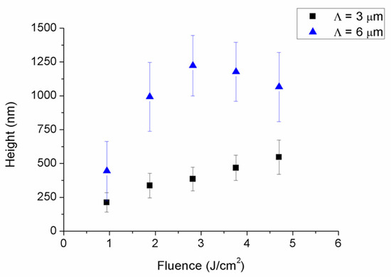 Next, profile measurements were taken by using confocal microscopy to evaluate the height of DLIP structures. As Figure 4 shows, structured height increased with laser fluence. For the case of samples structured with a spatial period of 3 µm, the increase was found to be linear. Nevertheless, in samples structured with a spatial period of 6 µm, the maximal height was achieved at a cumulated laser fluence of 2.82 J/cm2 (6 laser pulses of 0.47 J/cm2). Higher laser fluences led to a lower height due to both an increased damage induced by the laser radiation in the polymer and to the greater amount of material re-deposited onto the surface as a consequence of the laser ablation process. It is worth highlighting that the height of DLIP structures decreased with the spatial period, in good agreement with previous works found in the literature [41]. In addition to the DLIP height, surface roughness (Sa) was assessed by confocal microscopy, shown in Figure 5. It was observed that roughness was relatively high compared to the structure depth, and that increased with laser fluence until reaching a saturation value. This value was around 160 nm and was achieved with six laser pulses for samples structured with a spatial period of 3 µm, whereas this saturation value was higher and was reached earlier for samples processed with a spatial period of 6 µm. Specifically, it was found to be around 300 nm and was achieved with 4 laser pulses.