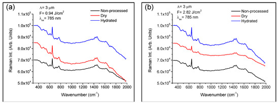 Confocal micro-Raman spectroscopy was performed in laser-structured areas as in dry stage after hydration assessment to investigate modifications in both polymer structure and chemical composition. Figure 7 shows Raman spectra in the wavenumber region 300–2000 cm−1 of the polymer sample in non-structured regions and in the DLIP processed areas with a spatial period of 3 µm at 0.94 J/cm2 (a) and 2.82 J/cm2 of cumulated laser fluence (b) before and after hydration assessment. Raman spectra showed sharp peaks and broad bands, which agreed with those previously reported in the literature [44,45]. These peaks and bands were assigned as follows: 605 cm−1, νsCCO; 646 cm−1, SiO3; 766 cm−1, SiCH3; 1425 cm−1 δCH2; 1457 cm−1 δCH2 and δCH3; and 1615 cm−1 νCO. It is observed that Raman spectra of areas structured at low cumulated laser fluence, 0.94 J/cm2, before and after hydration did not show significant changes when compared with non-processed areas, Figure 7a. Therefore, at low laser fluences the polymer structure remained almost unaltered and hydration process did not produce any substantial modification. However, areas structured at higher fluences showed a strong decrease in the intensity of Raman peaks placed at 646 cm−1, 766 cm−1, 1425 cm−1, 1457 cm−1, and 1615 cm−1, as shown in Figure 7b. This modification resulted from the photo-thermal damaged induced by the laser radiation. It is worth noting that Raman spectra of these samples after hydration process recovered the original shape of areas structured at low laser fluence, as shown in Figure 7b.