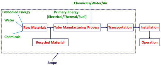 The functional unit for this study is the equivalent titanium-tube heat-transfer area of 1 m2. The scope consists of raw material extraction to the transportation of the tubes to Qatar. The system boundary for LCA is shown in Figure 2. The energy and material requirements for the commissioning and operation are not included in the system boundary. The tube manufacturing process for both titanium and polymer tubes are shown in Figure 3a,b. It can be seen that the titanium-tube manufacturing process requires several stages, while composite polymer (LDPE-expanded graphite) tubes can be easily manufactured. The required materials’ thermophysical properties are listed in Table 2, used to estimate the energy inputs. For LCA modeling, some assumptions and limitations are as follows: