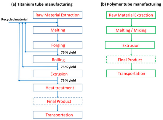 Titanium tubes are fabricated at high temperatures, 600–1040 °C. The yield of forging, rolling, and extrusion is considered as 75%. The remaining 25% is cycled via in-house recycling [26,30,40].