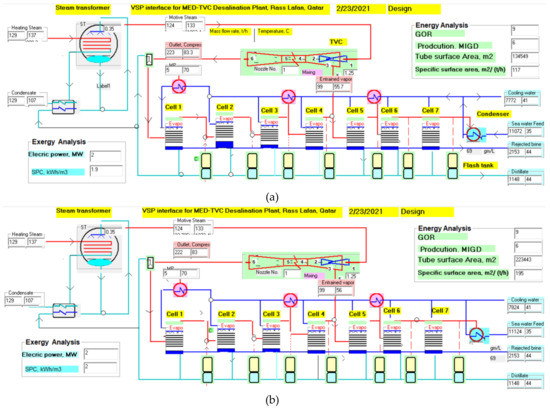 Figure 5. Interface of the visual simulation program (VSP) software for MED desalination plant (a) with titanium tubes and (b) with polymer-composite-material tube.