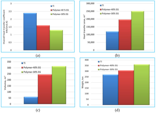 At different polymer–graphene mix of 60–40 and 70–30, the overall heat-transfer coefficient is calculated as shown in Figure 7a. The overall heat transfer of the Ti tubes is 35% higher than that of the polymer 60–40, while it is 45% higher than that of the polymer 70–30. As a result, the heat-transfer area of the enhanced polymer material 60/40 is 35% higher than the Ti tubes, while the heat-transfer area of the polymer-G 70/30 is 45% higher than that of Ti tubes, as shown in Figure 7b,c shows that the required material volume from polymer 70/30 is almost six times the Ti material, while the polymer 60/40 is five times of the Ti material. This is because of the larger heat-transfer area and using 1.25 mm thick for polymer, while using only 0.5 mm for Ti. Figure 7d shows that the weight of the polymer tubes 60/40 is 12% higher than the weight of the titanium tubes while the polymer–EG tubes 70/30 is 25% higher than that of the titanium tubes for the same level of heat-transfer level.